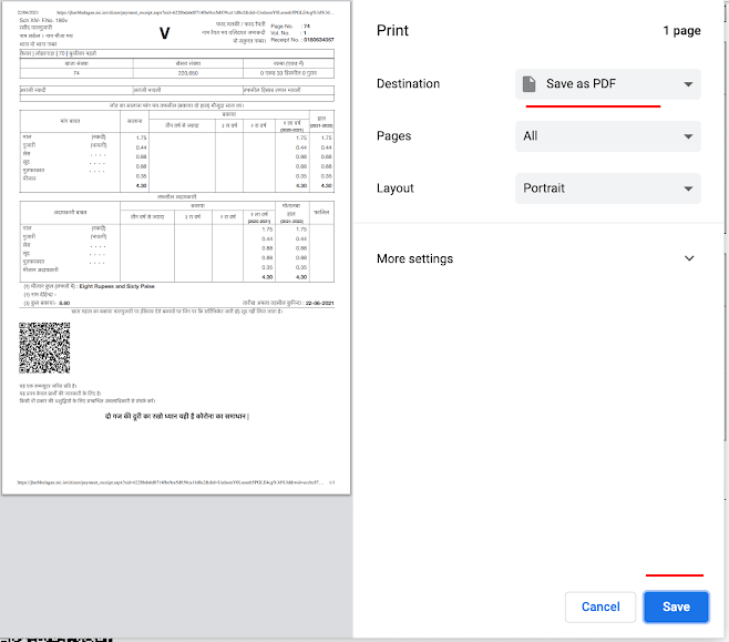 स्टेप-15. : आपका लगान Print फ़ॉर्मैट में खुल जाएगा। आप चाहे तो प्रिंट ले लिजीय या फिर PDF फ़ॉर्मैट में सेव कर लिजीए। सेव करने के लिए save पर क्लिक करे, अगर print लेना चाहते है तो आपका कम्प्यूटर प्रिंटर से जुड़ा होना चाहिए।