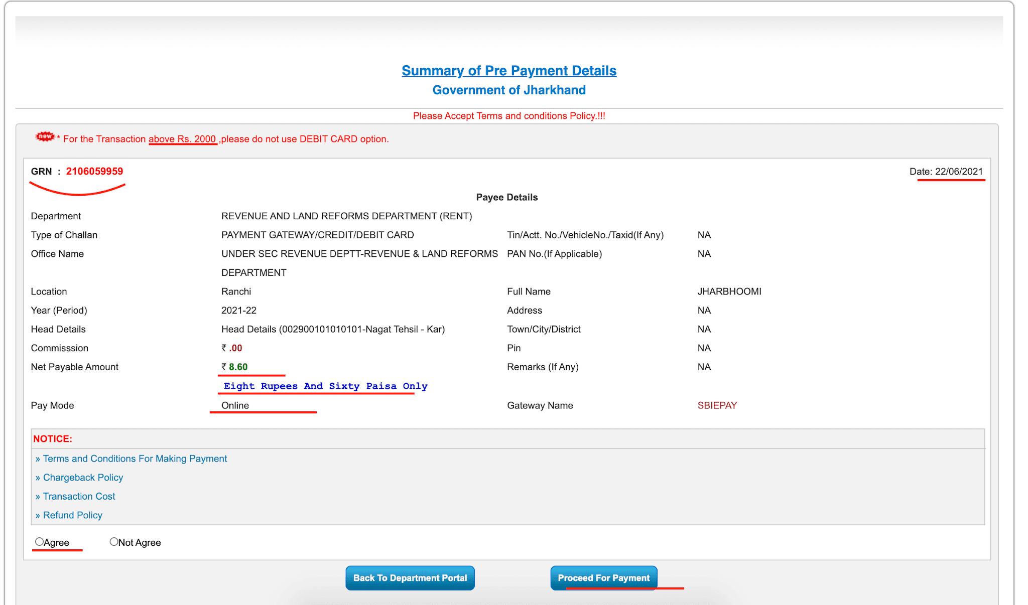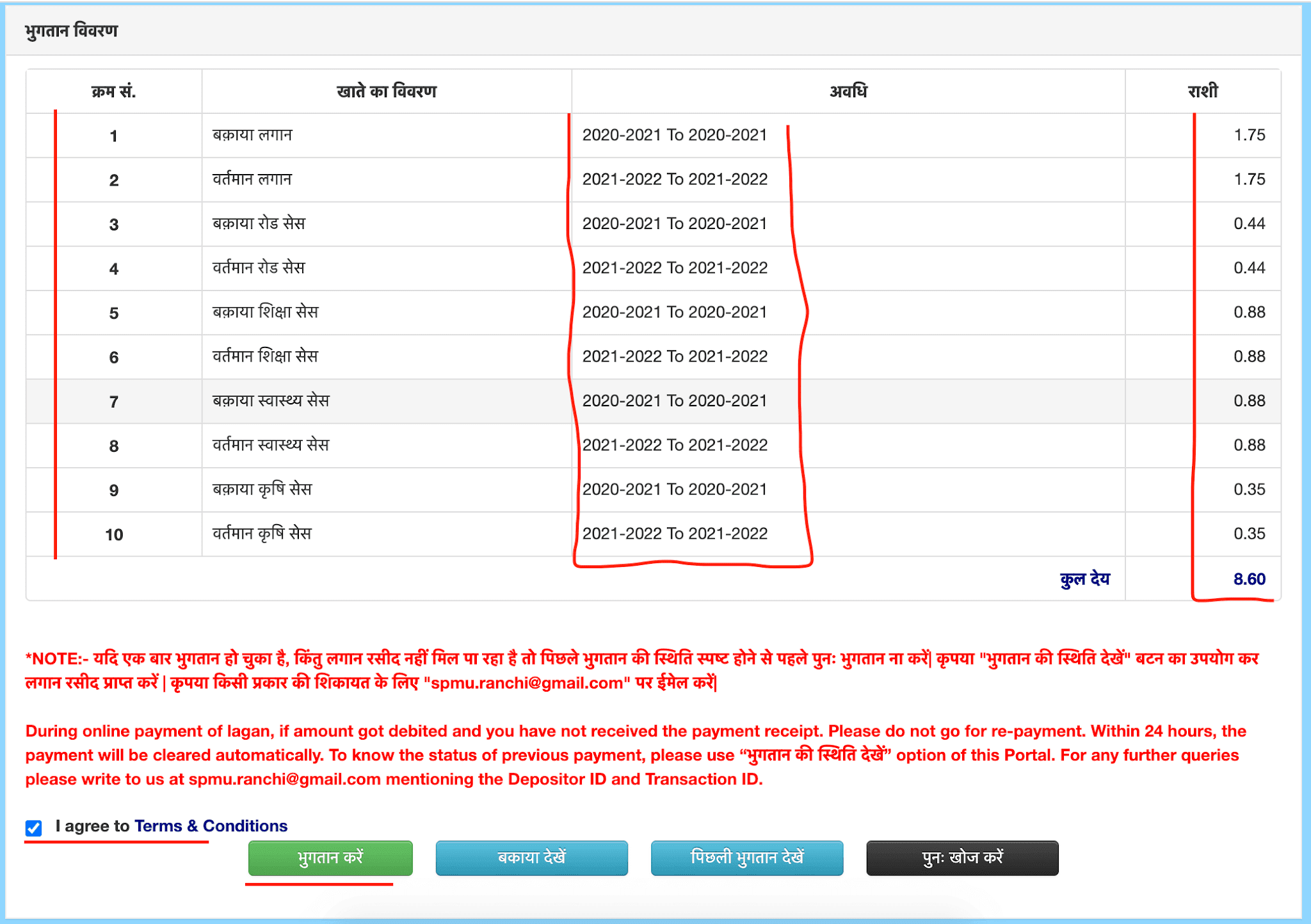स्टेप-8 : आपके सामने एक नया पेज खुल के आयगा आपको सबसे निचे आना है और I agree Terms & Conditions पर टिक करे, जैसे टिक करेंगे आपके पास एक पॉप अप बॉक्स आएगा, आप Deposite ID और Transaction ID नोट कर ले या फिर Screenshot ले लीजिए, पेमेंट फेल होने पर कम आ सकता है, उसके बाद भुगतान करें पर क्लिक करना है. जैसे निचे फोटो में है.