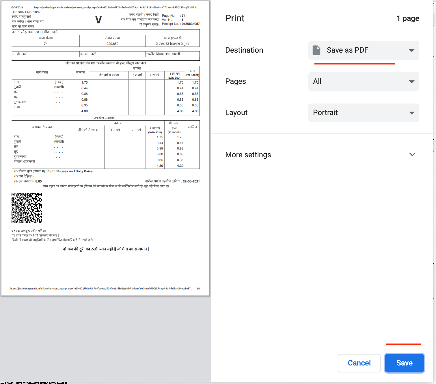 स्टेप-15. : आपका लगान Print फ़ॉर्मैट में खुल जाएगा। आप चाहे तो प्रिंट ले लिजीय या फिर PDF फ़ॉर्मैट में सेव कर लिजीए। सेव करने के लिए save पर क्लिक करे, अगर print लेना चाहते है तो आपका कम्प्यूटर प्रिंटर से जुड़ा होना चाहिए।
