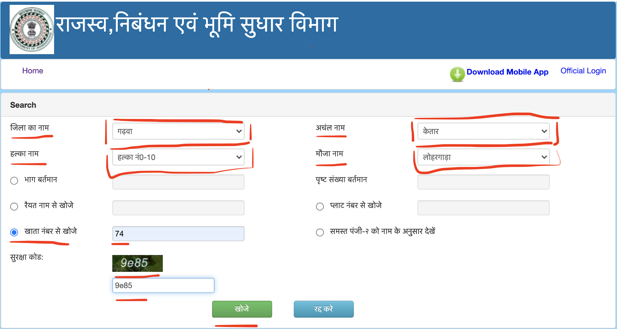 जैसे निचे फोटो में है.आप चाहे तो खाता नंबर की जगह, प्लाट नंबर ,रैयत का नाम भी डाल कर सर्च कर सकते है, लेकिन मैं आपको खाता नंबर को ही सजेस्ट करूँगा।
