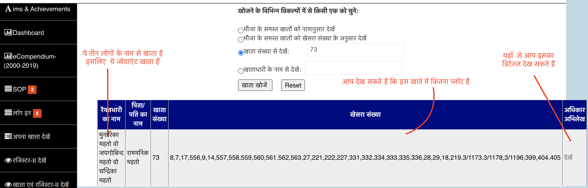 इसको एक उदाहरण से समझते हैं बैंक में एक गांव के एक आदमी का एक या एक से ज्यादा खाता भी हो सकता है और उसका जोवाएंट खाता भी हो सकता है चाहे उसके वाइफ़ के साथ या किसी दूसरे फ़ैमिली मेम्बर कि साथ जैसे माता, पिता, भाई किसी के साथ भी हो सकता हैं। और एक से ज़्यादा बैंकों में भी हो सकता है और बैंक खाता से यह पता चलता है की उस आदमी के पास कितना पैसे है या सभी खाते मिलकर कितना कुल पैसा हैं। उसी तरह से सेम टू सेम जमीन में भी होता हैं।