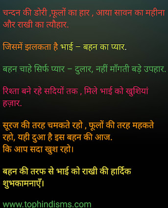 जो भाई बहन दूर होते है वो अक्सर अपनी शुभकामनाये raksha bandhan wishes के द्वारा अपनों तक पहुंचते है। tophindisms भी अपने दर्शको के लिए raksha bandhan quotes in hindi में ले कर आया है।